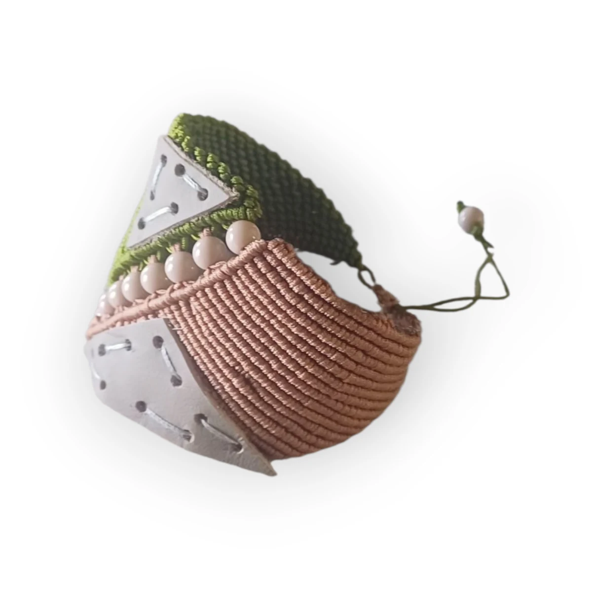 Ένα εντυπωσιακό χειροποίητο cuff βραχιόλι με έντονη προσωπικότητα. Φτιαγμένο από μακραμέ κορδόνι σε φυσικές αποχρώσεις του καφέ και του πράσινου, το σχέδιό του συνδυάζει γεωμετρικά μοτίβα με μια ανεπιτήδευτη, χειροποίητη αισθητική.