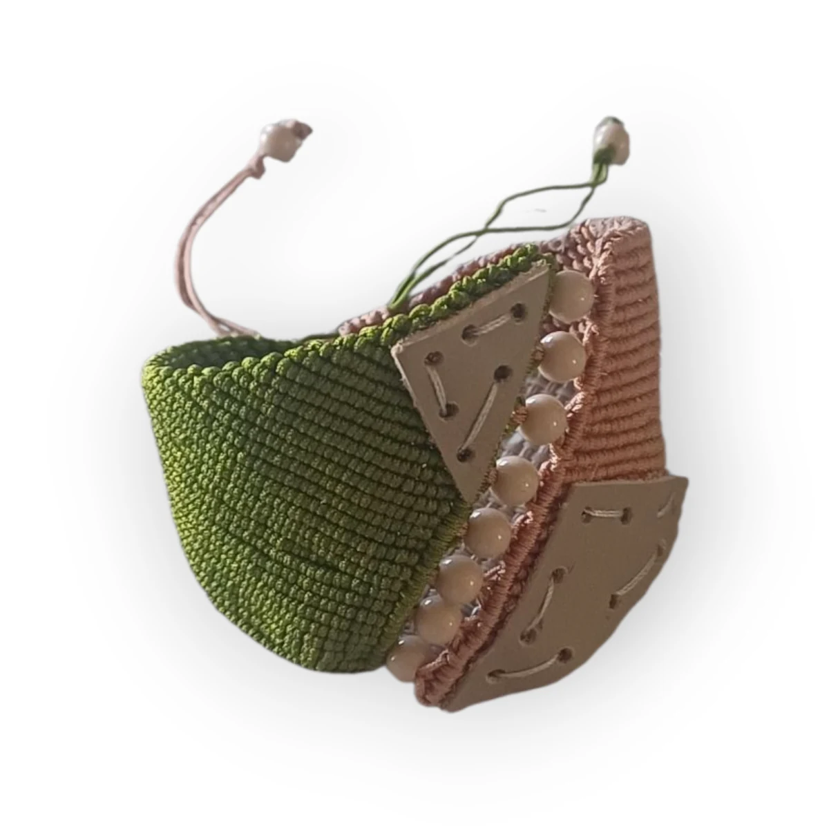 Μακραμέ Cuff Βραχιόλι σε Καφέ & Πράσινες Αποχρώσεις – Με Δερμάτινες Λεπτομέρειες και Γεωμετρικό Σχέδιο