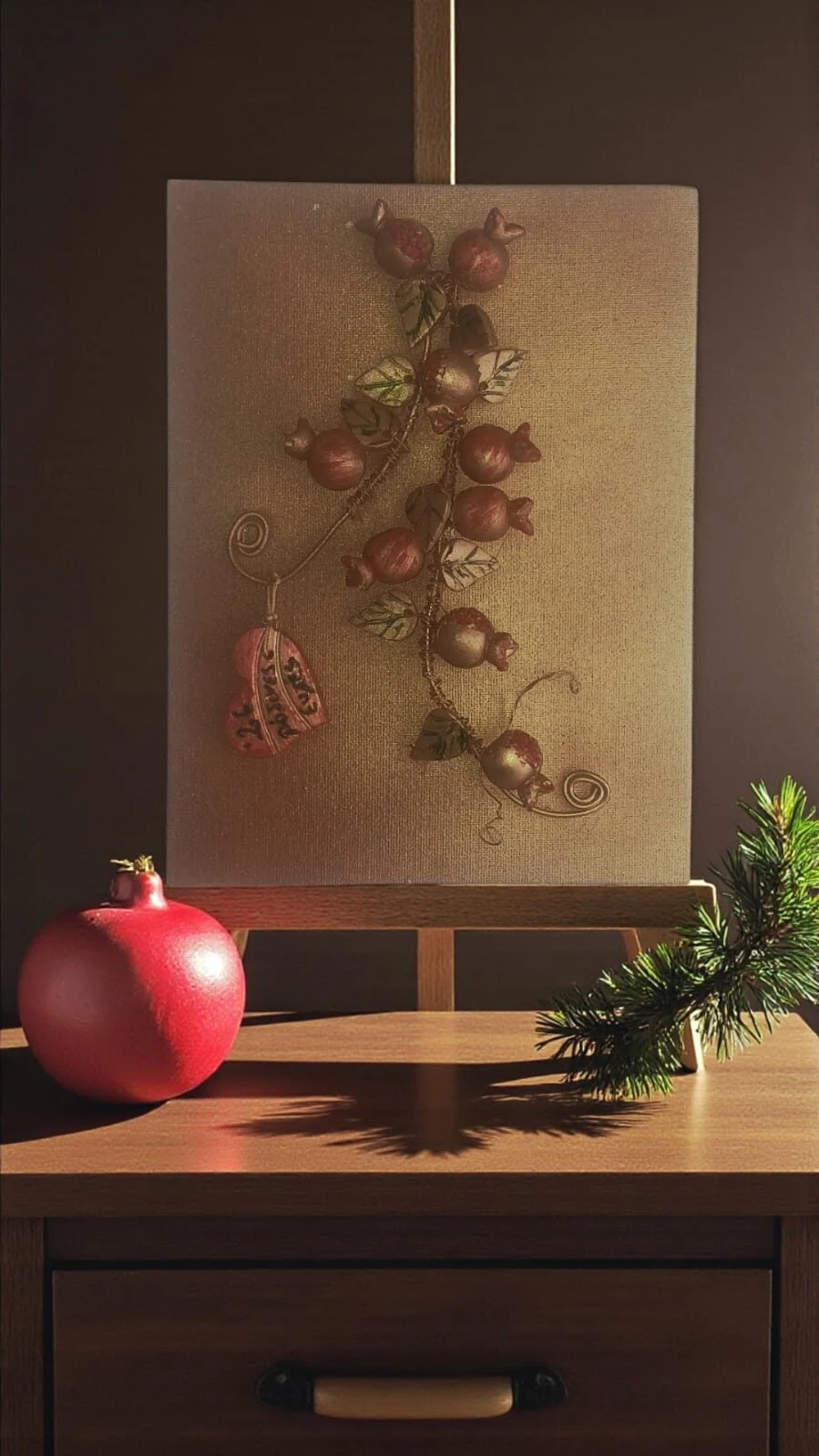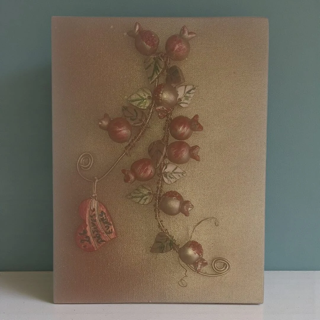 Το ρόδι, σύμβολο αφθονίας, καλοτυχίας και νέας αρχής, αποτυπώνεται σε τρισδιάστατη μορφή, με ρόδια και φύλλα από Jesmonite, σε ζεστές αποχρώσεις χρυσού, καφέ και μπορντό.