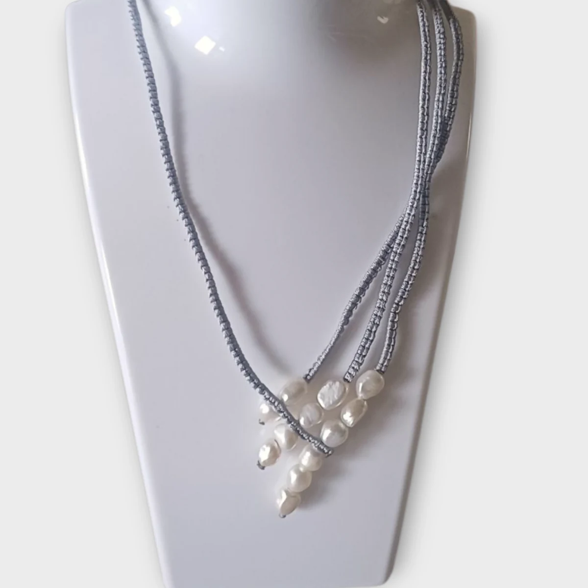 Statement Μακραμέ Κολιέ με Πέρλες & Γεωμετρική Δομή – Μοντέρνα Κομψότητα σε Γκρι Σατέν