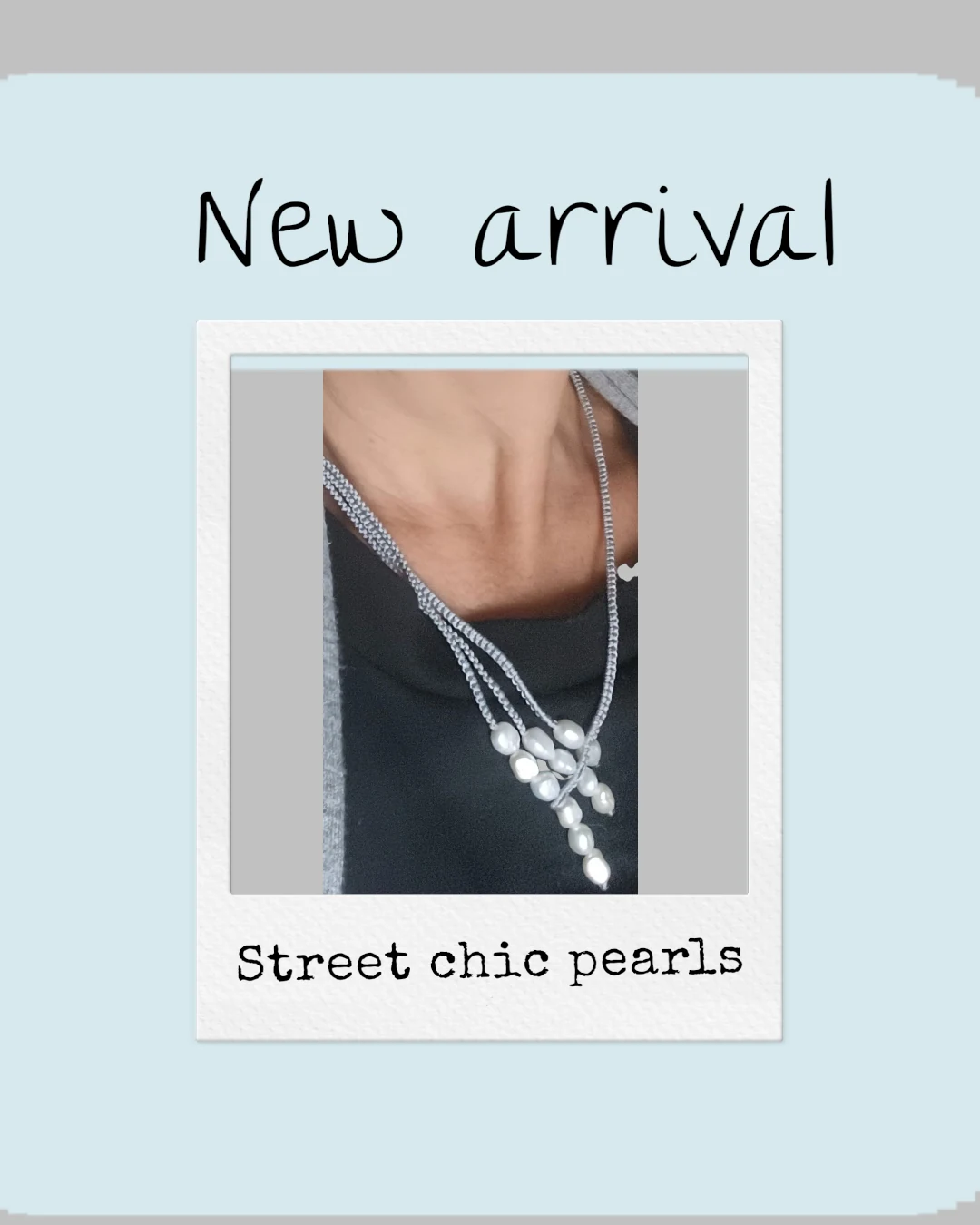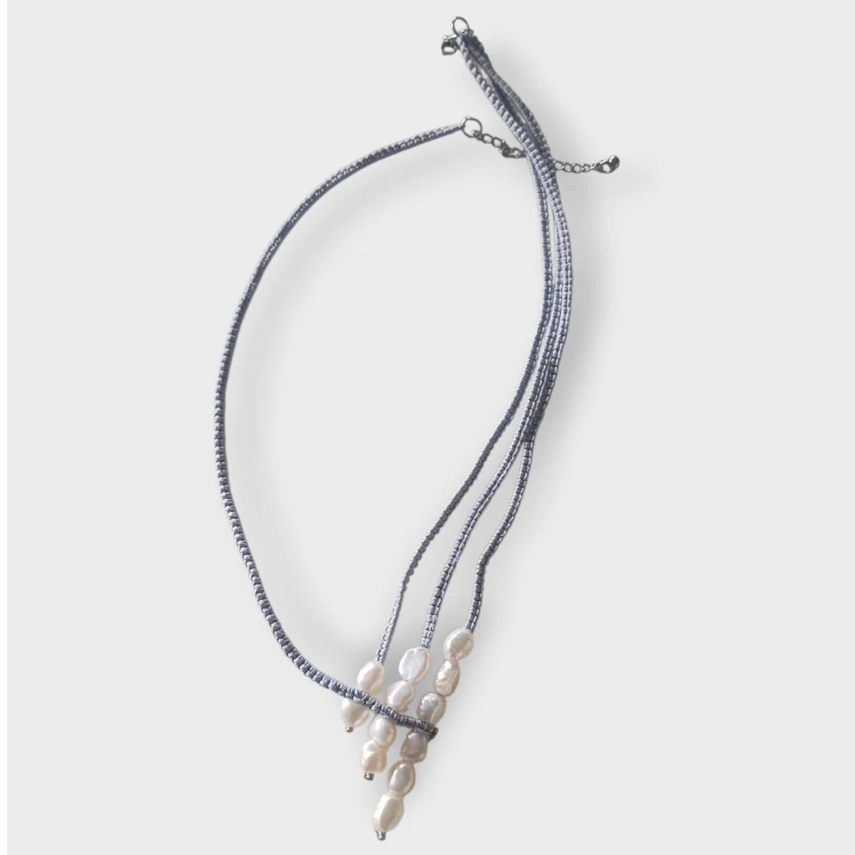 Το γκρι σατέν κορδόνι προσδίδει μια ανεπιτήδευτη λάμψη, ενώ οι πέρλες —σε ρόλο-έκπληξη— προσθέτουν μια σύγχρονη πινελιά κλασικής πολυτέλειας. Ρυθμιζόμενο, με μήκος περίπου 50 εκ., αγκαλιάζει τον λαιμό δημιουργώντας ένα κομψό, αλλά ταυτόχρονα bold αποτέλεσμα.
